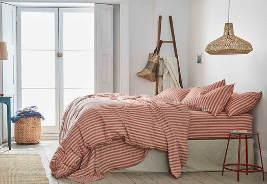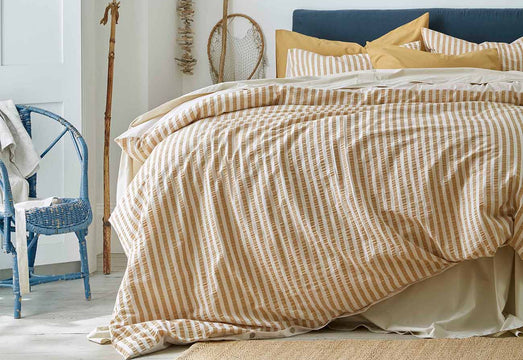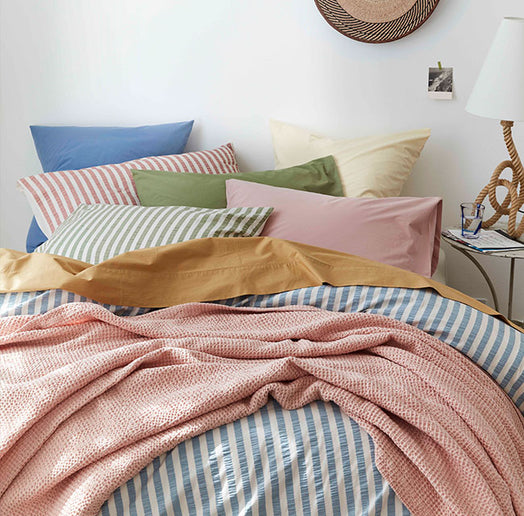 Four new sorbet-toned stripes join our cotton bedding collection this summer. Made in Portugal from sustainably-sourced cotton and featuring a softly-textured seersucker stripe, Pear, Desert Sand, Warm Blue, and Ochre Seersucker Stripe are inspired by the colorful and eclectic homewares found in a rustic beach house.