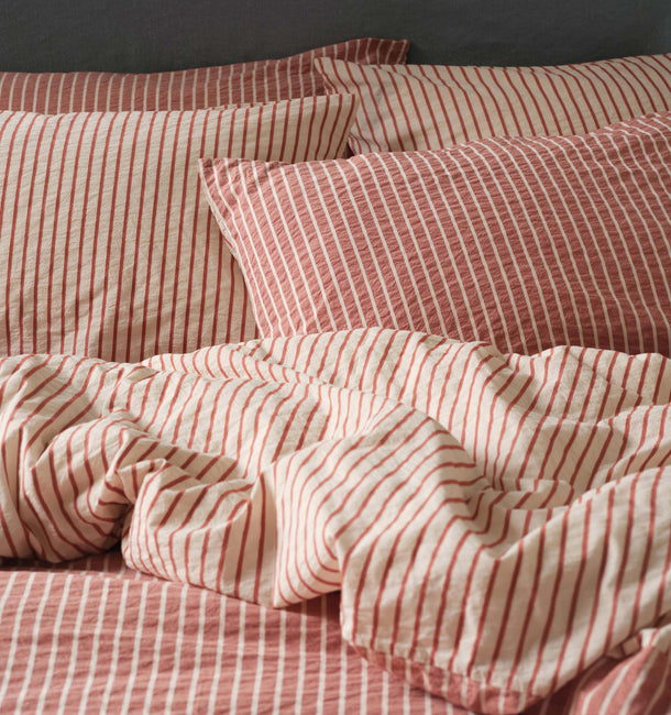 Classic stripes with a clever two-in-one design make mix-and-match styling as easy as can be with this Auburn Red Textured Stripe duvet cover. Woven from 100% cotton with a textured finish, this bedding is wonderfully soft and breathable with a relaxed, lived-in feel. All our cotton duvet covers feature natural corozo button fastenings and handy inside corner ties to stop your duvet from slipping.
