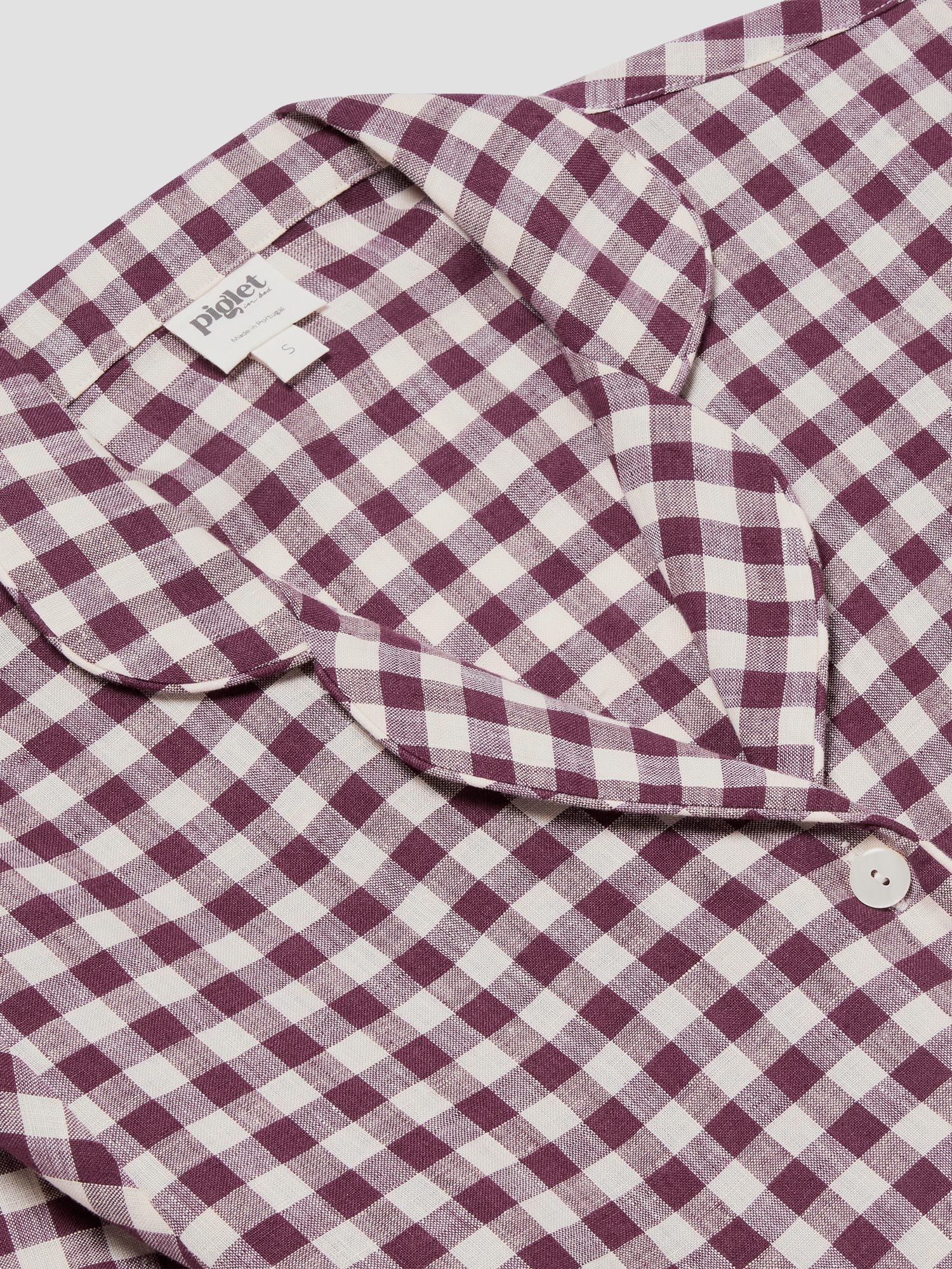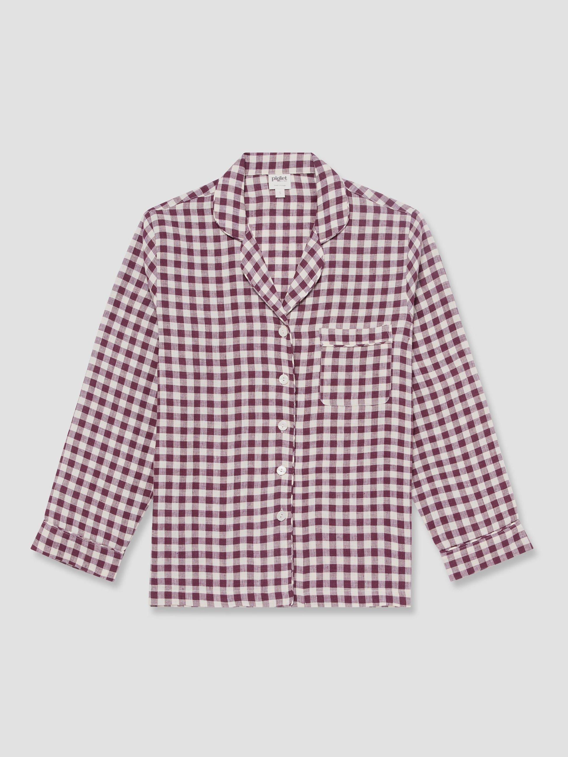 Made from super soft 100% stonewashed linen, our Berry Gingham Linen Pajama Shirt is perfect for all-year-round snoozing and weekend slouching - linen keeps you cozy and warm in the winter and cool in the summer. This whimsical print and striking color can be paired with our pajama trousers or shorts to complete the look. Our gingham sleepwear is an oversized, and more relaxed fit than our core range; we recommend sizing down if a more snug fit is desired.