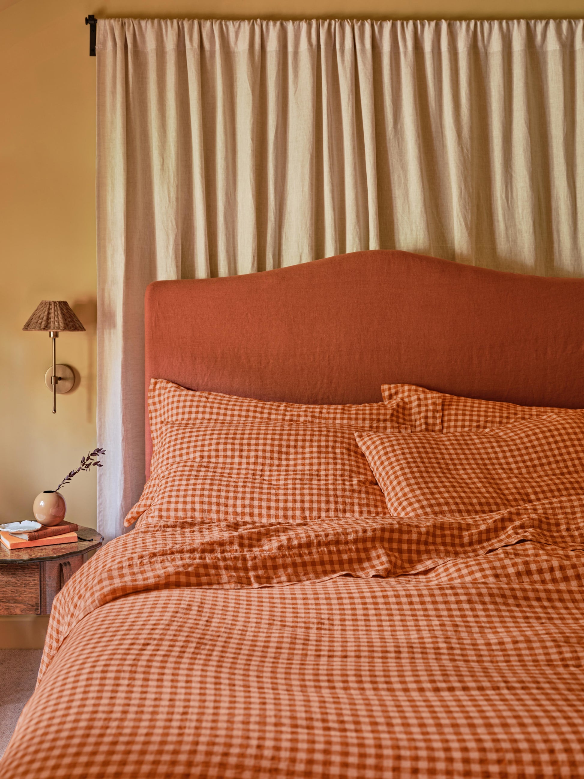 Pairing rich Cinnamon with soft Peach, our Color Drenched Gingham linen blend duvet cover serves up the perfect laid-back, layered look. Made from only the highest-quality fibers, the breathable fabric combines the effortless look of linen with the softness of cotton. Our linen blend duvet covers are finished with coconut shell button fastenings and feature handy inside corner ties to stop your duvet from slipping.
