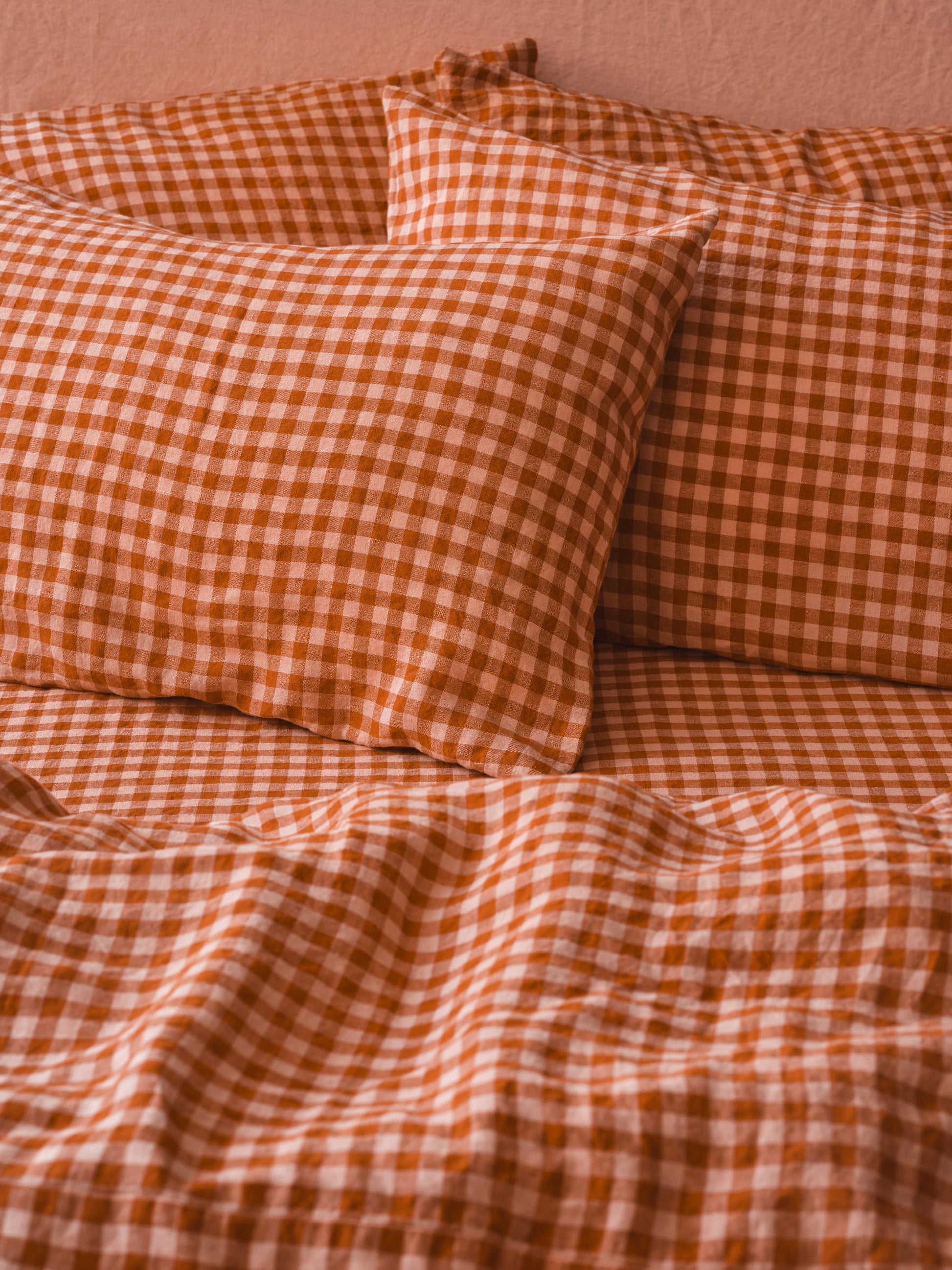 Cinnamon & Peach Colour Drenched Gingham Linen Blend Pillowcases (Pair)