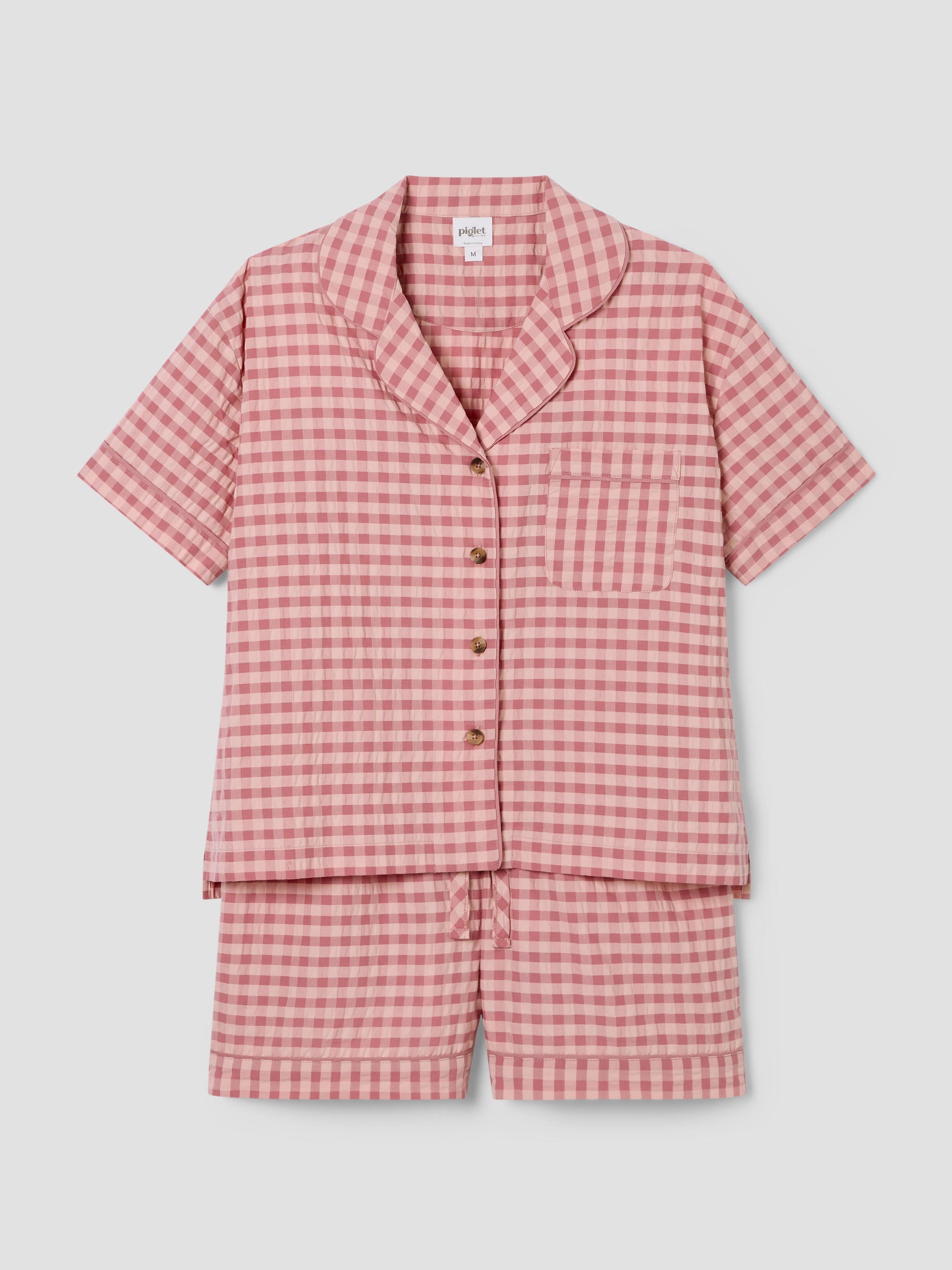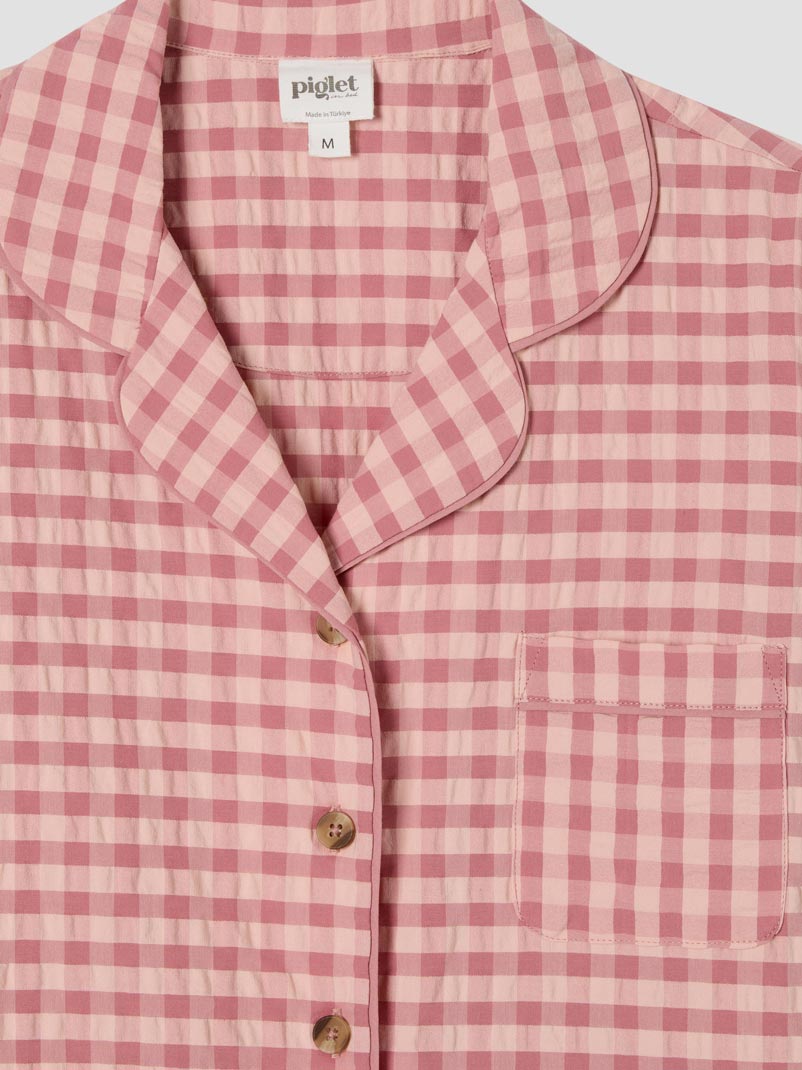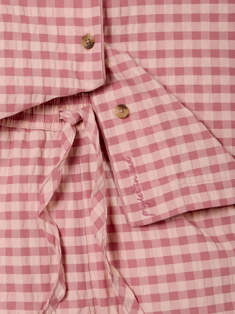 Designed for slow mornings and cozy evenings, this cotton pajama set pairs a classic short-sleeved shirt with relaxed shorts in our Dusty Pink & Rose Color Drenched Gingham. Crafted from breathable 100% cotton seersucker, it features matching trim along the edges and subtle Piglet in Bed embroidery on the shirt for a thoughtful finishing detail.