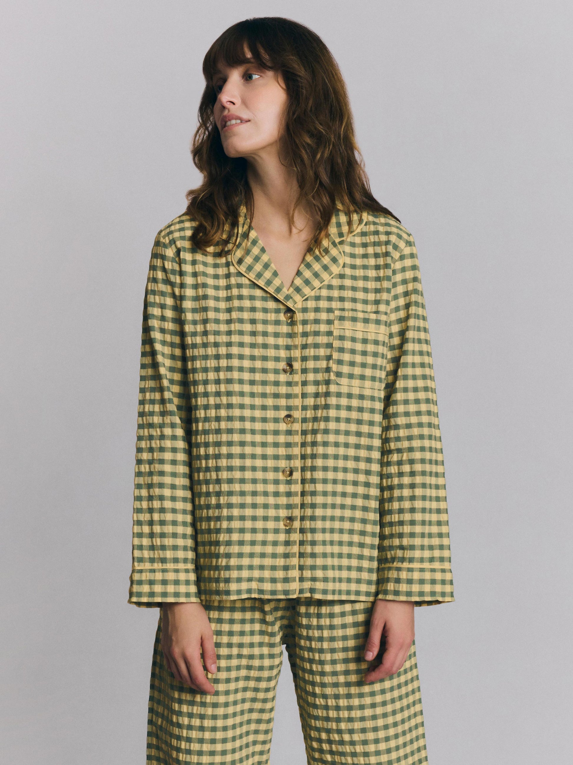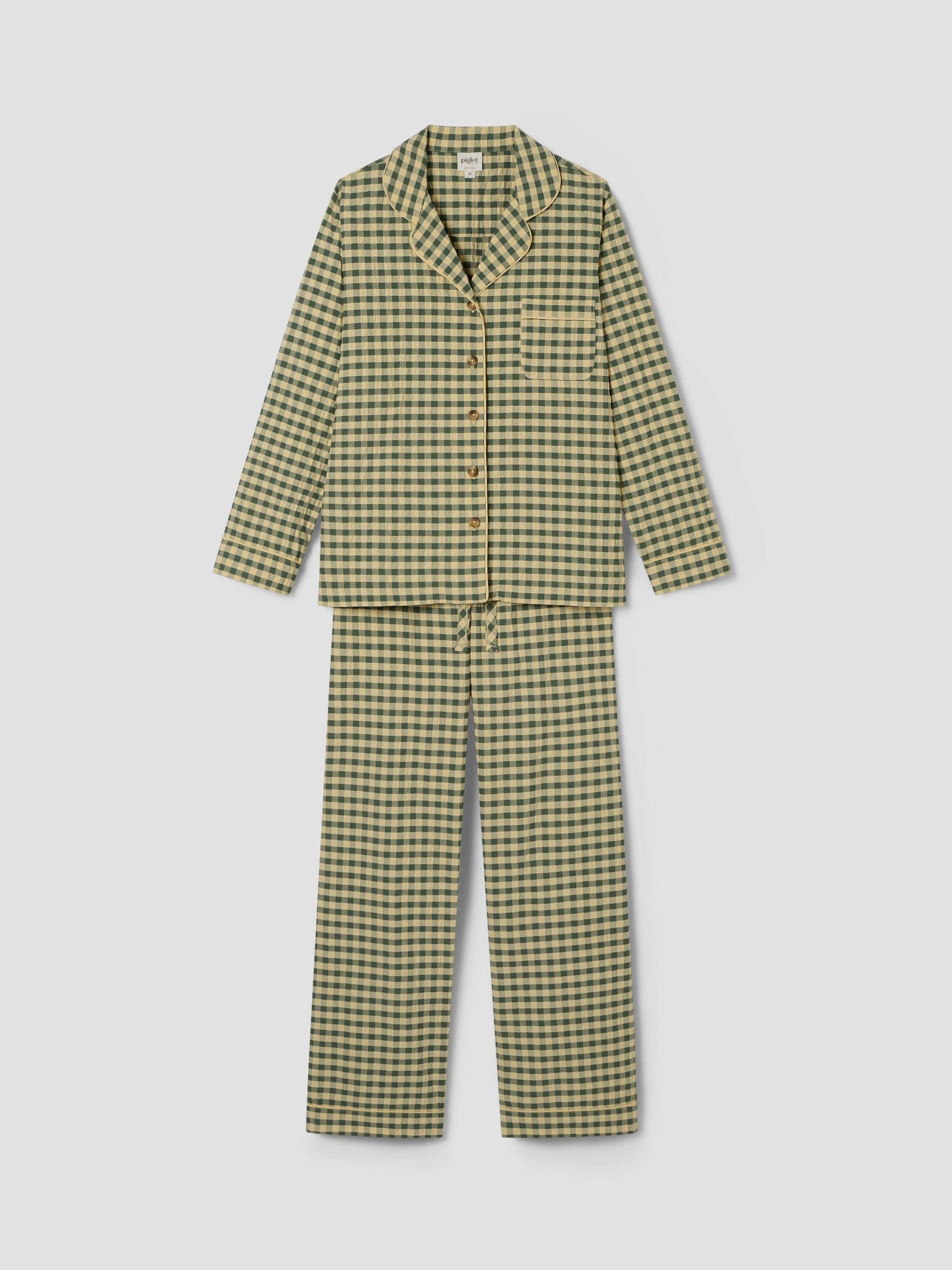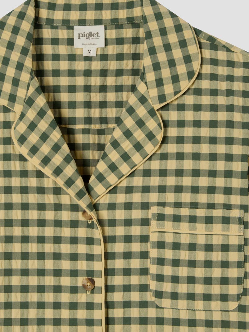 Designed for slow mornings and cozy evenings, this cotton pajama set pairs a classic button-up shirt with relaxed pants in our Elm Green & Butter Yellow Color Drenched Gingham. Crafted from breathable 100% cotton seersucker, it features matching trim along the edges and subtle Piglet in Bed embroidery on the shirt for a thoughtful finishing detail.