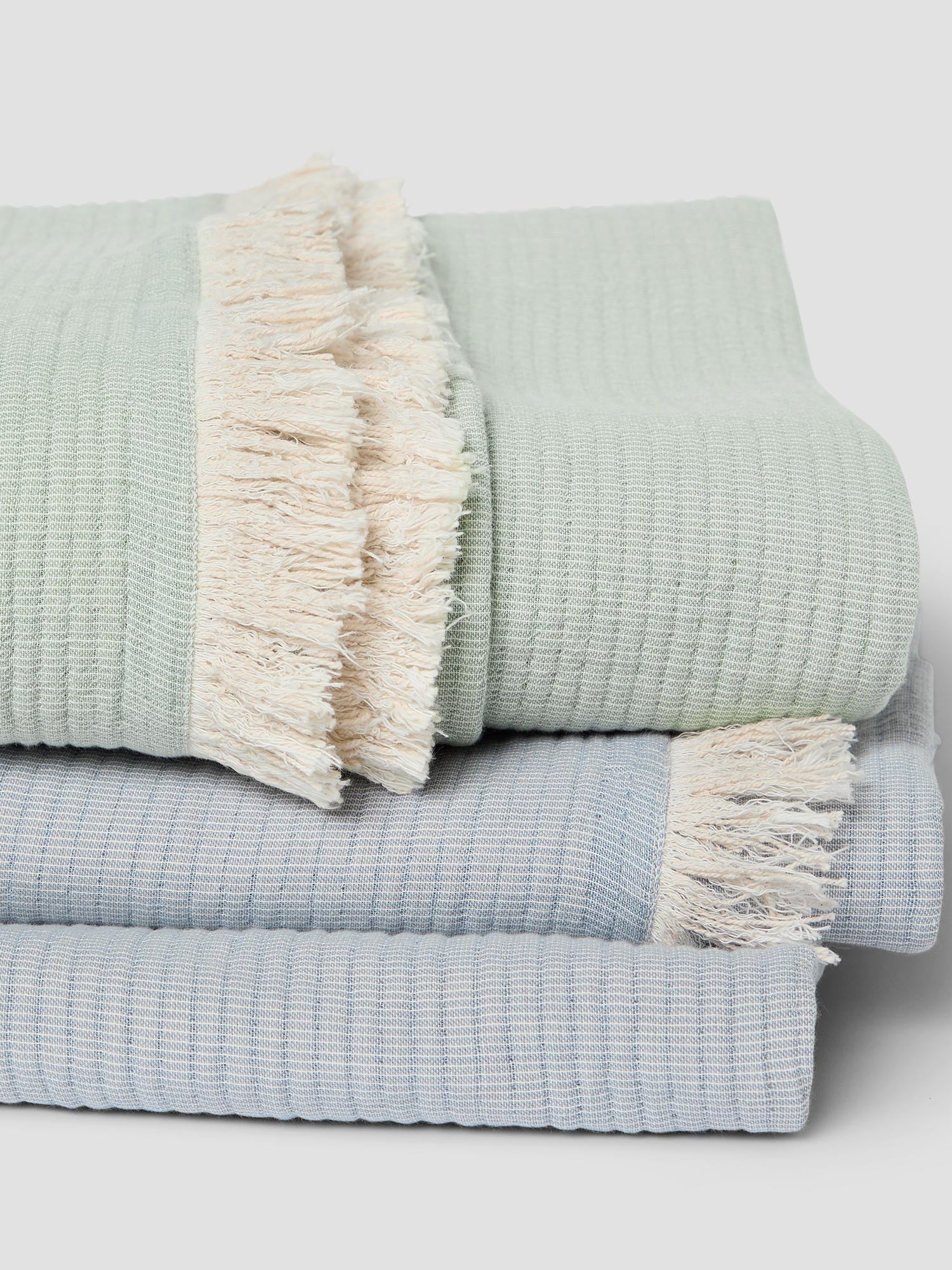 The Elm Green cotton textured throw is expertly woven with a double-weave design, creating a subtle, ruched texture that offers breathable warmth and a soft finish. Topped off with delicate fringed edges, this throw is perfect for layering on a bed or draping over your favorite armchair.