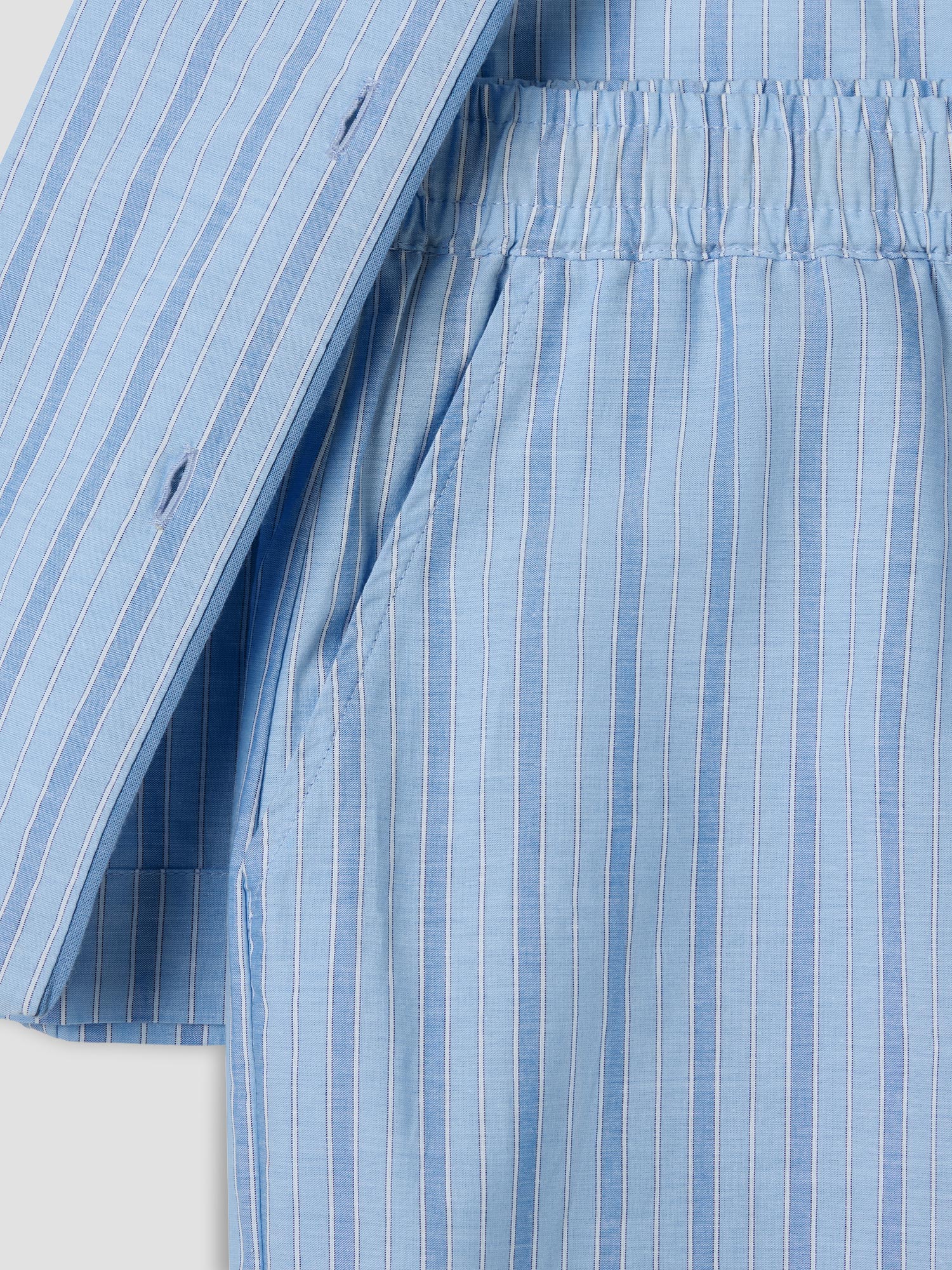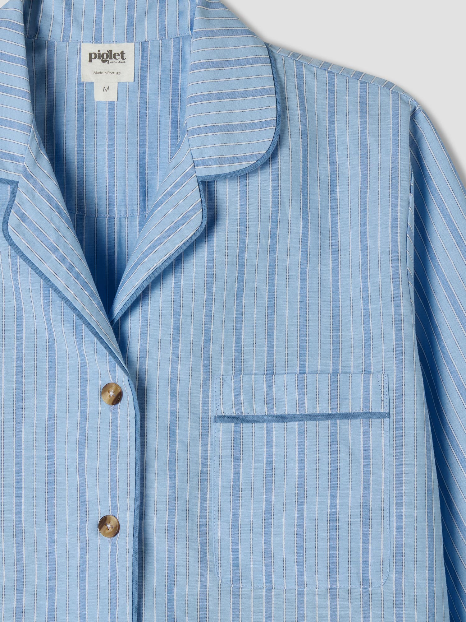 Featuring a ¾ sleeve shirt and cropped trousers, this Pale Blue Favorite Shirt Stripe cotton pajama set shows that sophisticated sleepwear isn’t just for bedtime. Crafted from 100% prewashed cotton for extra softness and a lived-in feel, this is loungewear you’ll want to stay in all day long.