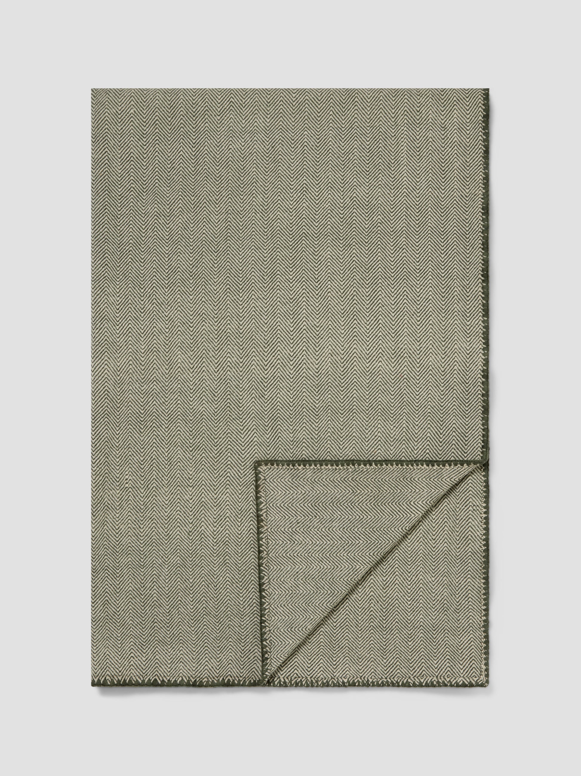 Your go-to for chilly winter nights, this Herringbone wool blanket is luxuriously thick and generous in size. Alternating weaves of earthy Fern Green and complementary cream create the classic zig-zag pattern, topped off with a triangle border for added texture. Perfect for lounging and layering this cozy season.