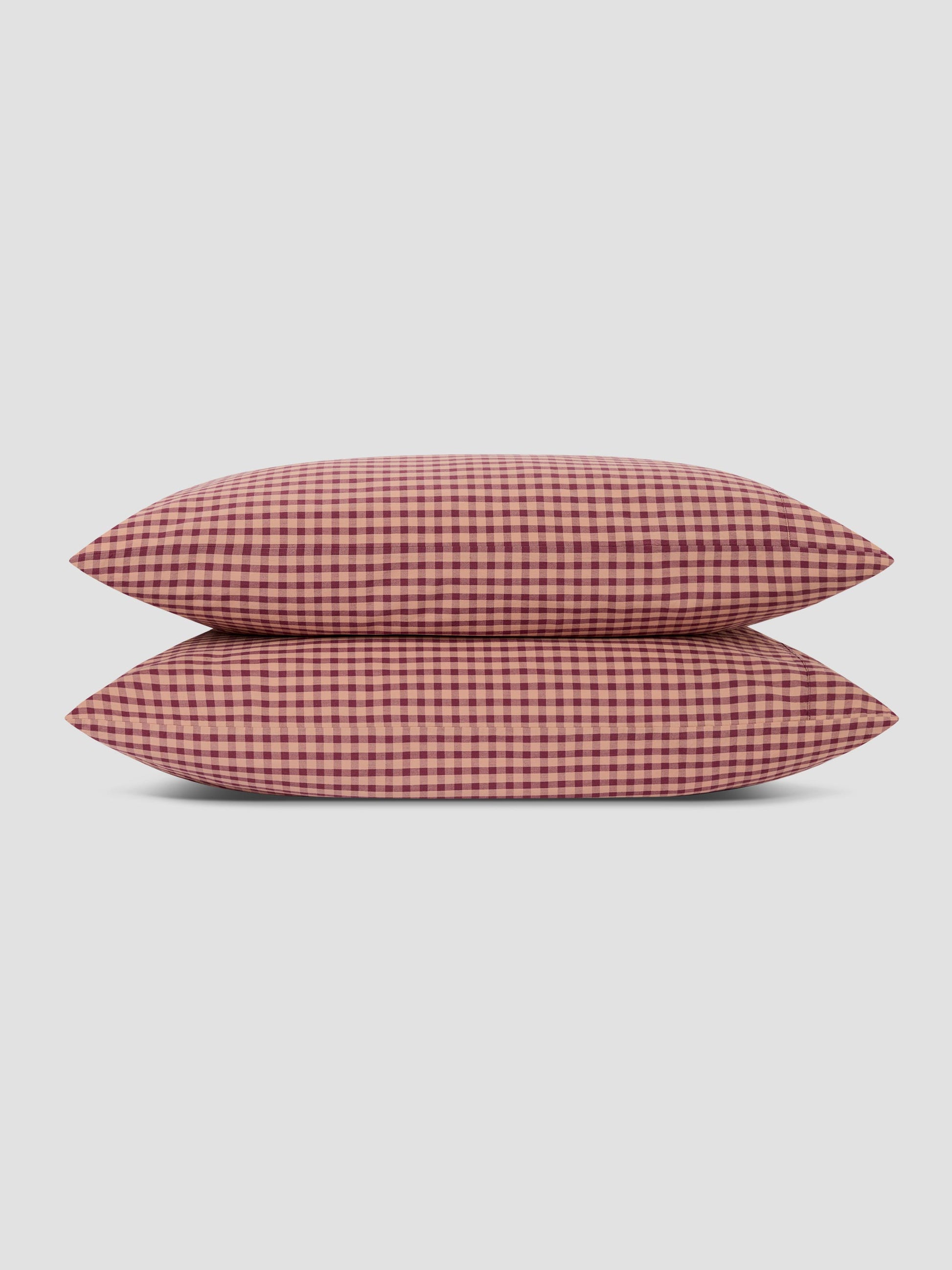 Fig & Blush Pink Gingham Washed Cotton Percale Pillowcases (Pair)