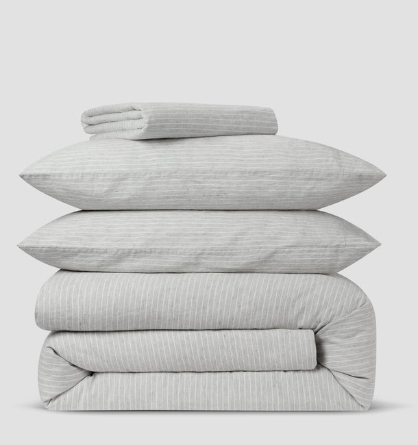 Crafted in a cross-weave pattern with delicate horizontal stripes, our Gray Stripe linen blend flat sheet offers timeless style with a lightly textured finish. Made from only the highest-quality fibers, the breathable fabric combines the effortless look of linen with the softness of cotton. Layer in the colder months or use as a lightweight cover on warmer summer nights.
