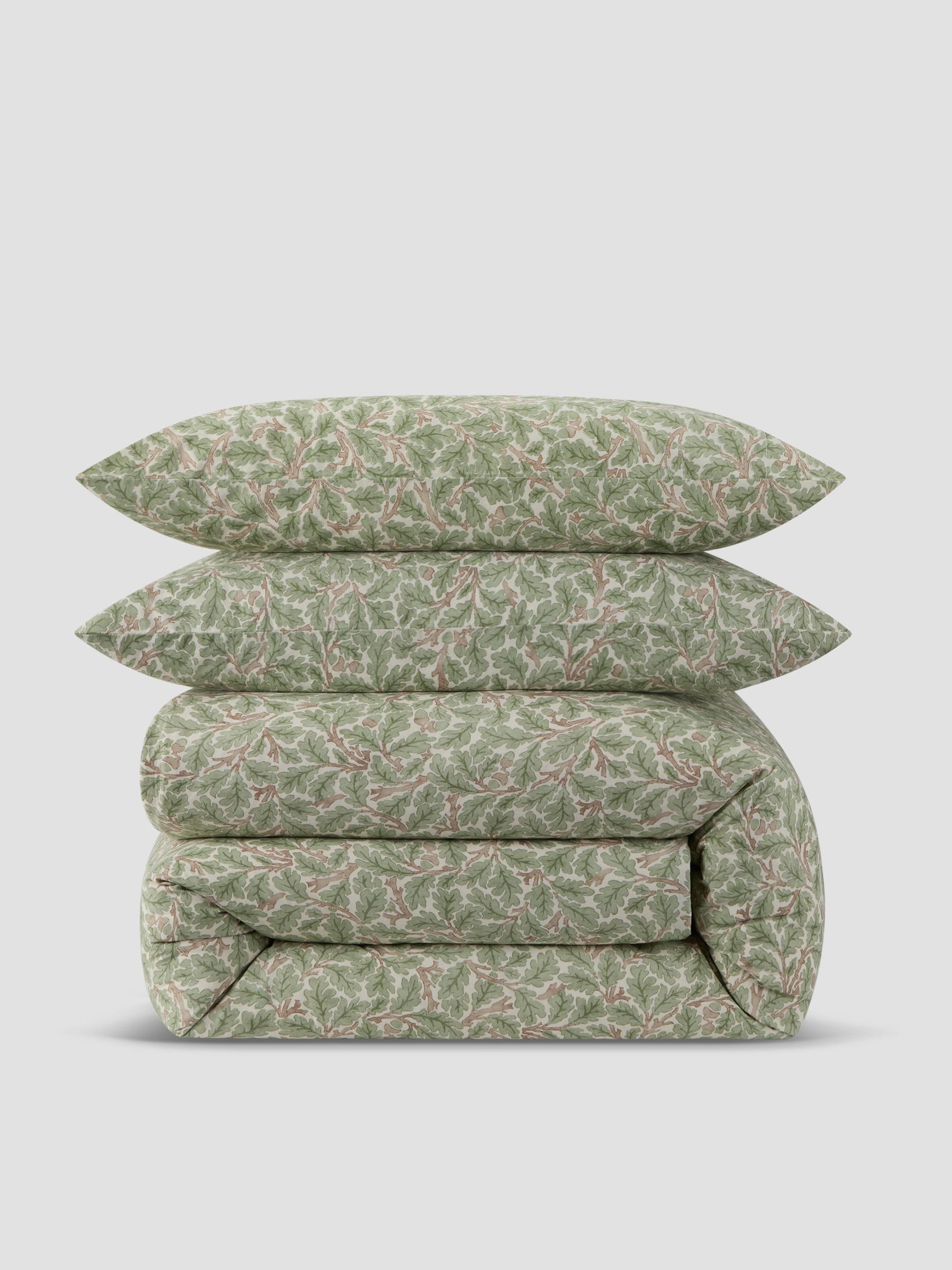 Climbing branches, scattered acorns and a soft Leafy Arbour green hue make this Morris & Co. Oak duvet set a charming woodland escape for your bedroom. Woven from 100% washed cotton, this bedding is wonderfully smooth and breathable with a relaxed, laid-back feel. Our duvet set includes one duvet cover and one pair of pillowcases (standard size for twin and queen sets, and king size for king sets).