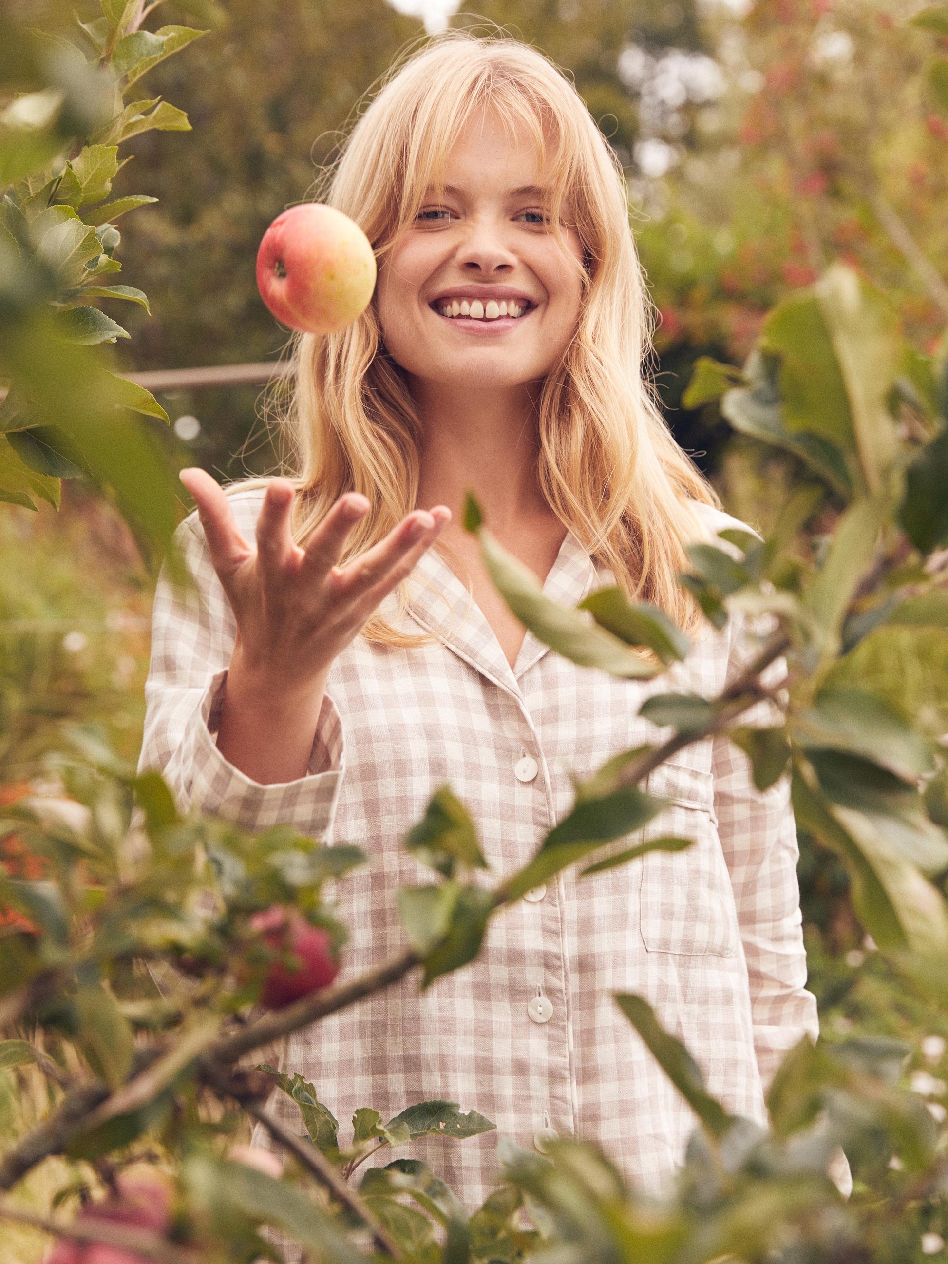 For a blissful night's kip, snuggle into nostalgic neutrals with our Mushroom Gingham Linen Pajama Shirt, made from super soft 100% stonewashed linen. Made for slow weekend mornings and cozy nights in, our gingham linen sleepwear collection is completely natural and thermo-regulating, keeping you snug during winter and cool throughout the summer. This whimsical print and organic-toned color can be paired with our linen pajama trousers or shorts to complete the look. Our gingham sleepwear is an oversized, and more relaxed fit than our core range; we recommend sizing down if a more snug fit is desired.