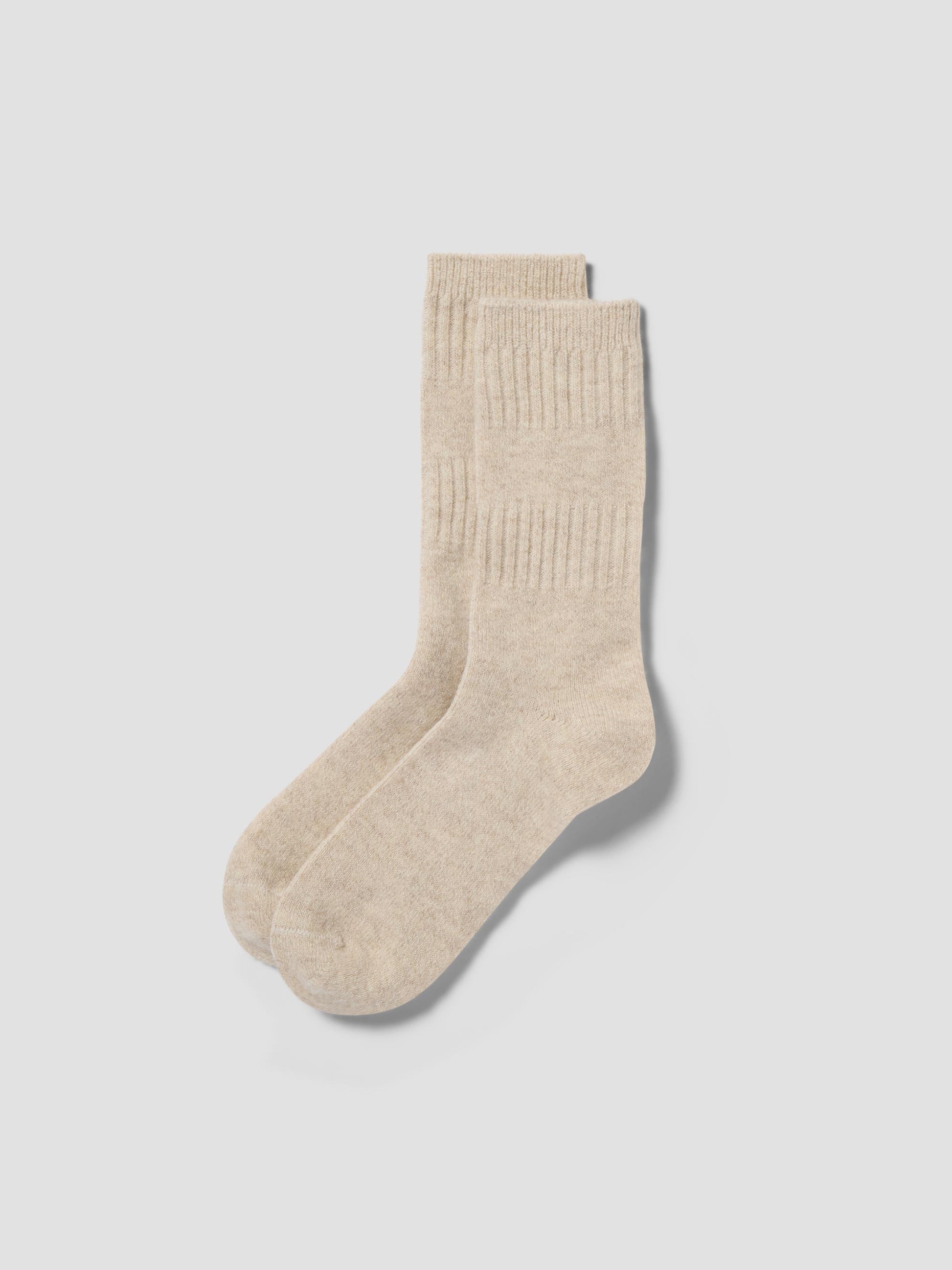 Keep your feet nice and toasty with these Oatmeal Merino Wool Ribbed Socks. Naturally breathable and thermoregulating, they feature a classic double-rib pattern and a subtle marl effect for a timeless, cozy finish – perfect for padding around the house or wearing under boots on a winter walk.