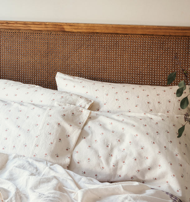 Romantic, whimsical and dotted with delicate flowers, our Posy Bud linen blend duvet cover features a reimagined vintage pattern from the Susanna Samson Design archives. Made from only the highest-quality fibers, the breathable fabric combines the effortless look of linen with the softness of cotton. Our linen blend duvet covers are finished with coconut shell button fastenings and feature handy inside corner ties to stop your duvet from slipping.