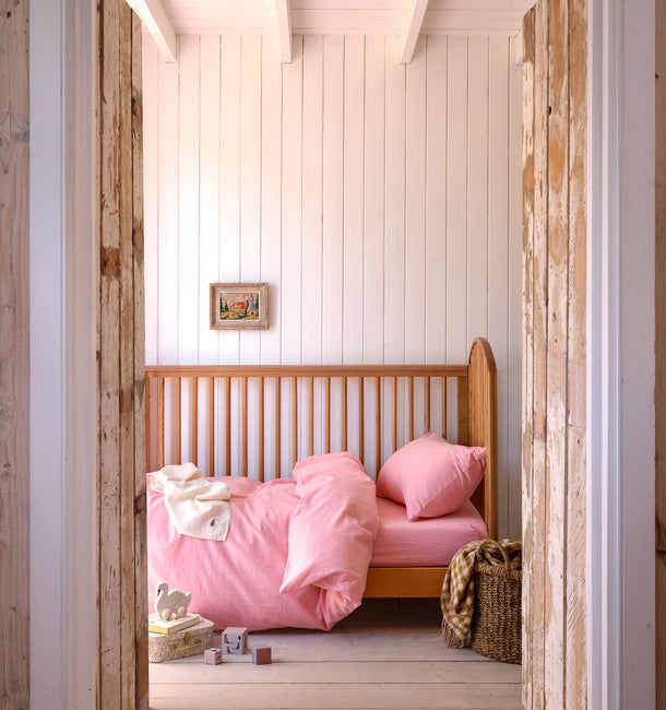 With a joyful, rosy hue, our Pink Bloom Kids linen blend fitted sheet is the perfect pastel for a playful yet elevated bedroom. Made from only the highest-quality fibers, the fabric combines the relaxed look of linen with the softness of cotton, for breathable bedding that’s gentle on even the most sensitive skin. Our kids’ fitted sheets are suitable for cot bed mattresses (27.5in x 55in x 6in) and have elasticated edges all the way around for a perfectly snug fit.
