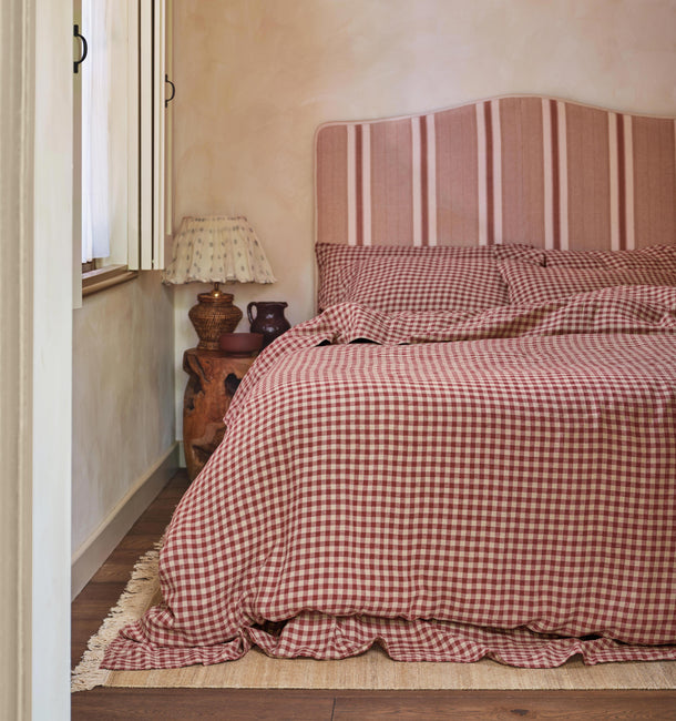 Timeless yet on-trend, our playful Rhubarb Gingham linen blend duvet cover is the ultimate choice for modern cottagecore style. Made from only the highest-quality fibers, the breathable fabric combines the effortless look of linen with the softness of cotton. Our linen blend duvet covers are finished with coconut shell button fastenings and feature handy inside corner ties to stop your duvet from slipping.