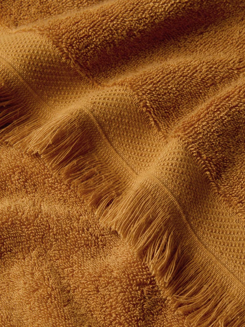 Scrub up well with our irresistibly plush Russet Yellow Fringe Edge towels. Woven from long-staple, single-yarn cotton, they’re naturally soft and durable, with a delicate fringe edging to finish. Available in three sizes (bath sheets, bath towels, and hand towels), they’re perfect for mixing and matching with other colors and patterns from our collection.