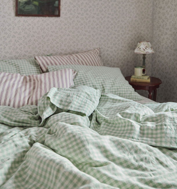Add a touch of modern cottagecore style to your bedroom with our Sage Green Gingham linen blend bed skirt. Featuring our signature gingham pattern, this classic gathered skirt drapes beautifully with its soft frills. Our bed skirts have a 15-inch drop from the base to the floor and come in four sizes for twin, full, queen and king beds.