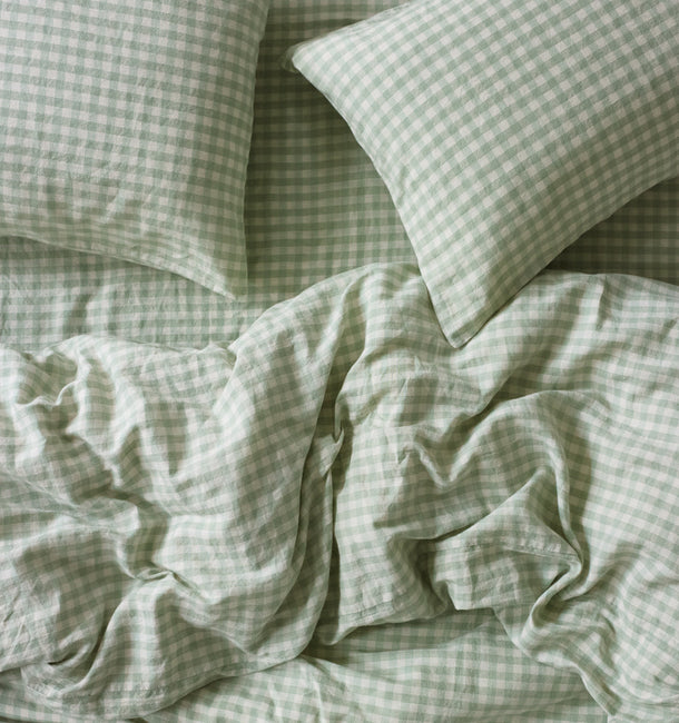 Timeless yet on-trend, our playful Sage Green Gingham linen blend duvet set is the ultimate choice for modern cottagecore style. Made from only the highest-quality fibers, the breathable fabric combines the effortless look of linen with the softness of cotton. Our duvet set includes one duvet cover and one pair of pillowcases (standard size for twin and queen sets, and king size for king sets).