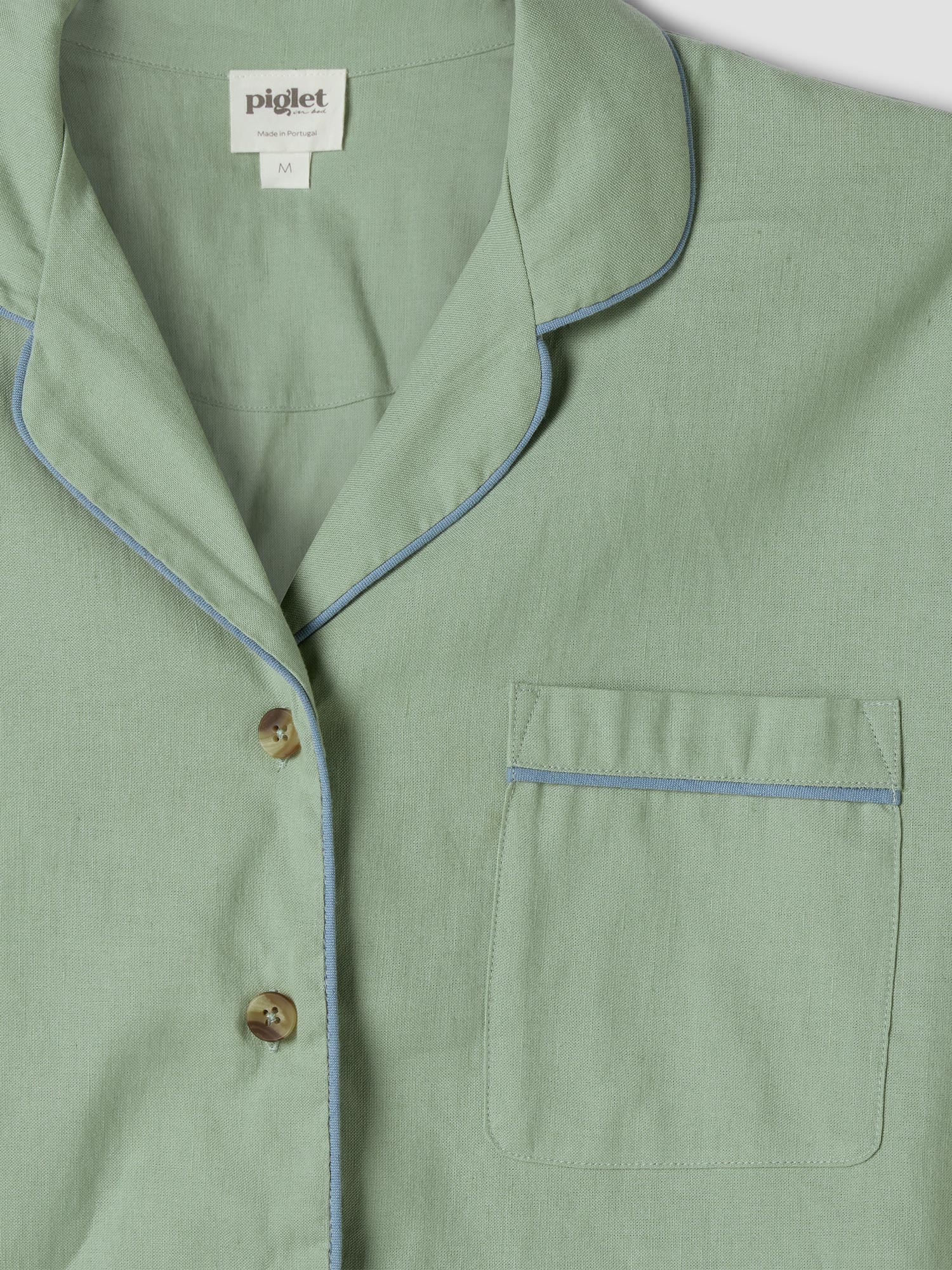 Made for easy, breathable wear, our Sage Green linen blend pajama short set will have you waking up feeling refreshed and ready to seize the day. Combining the laid-back look of linen with the gentle softness of cotton in our calming green hue, these pajamas are destined to become your new nighttime favorite.