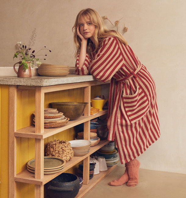 Our Sandstone Pembroke Stripe cotton hair wrap is a haircare must-have for your post-shower routine. The super soft and absorbent fabric will soak up excess moisture to cut down on drying time, and it’s perfect for keeping your pillow clean when indulging in an overnight hair mask. Our hair wraps feature a handy elasticated loop and corozo button for easy fastening.