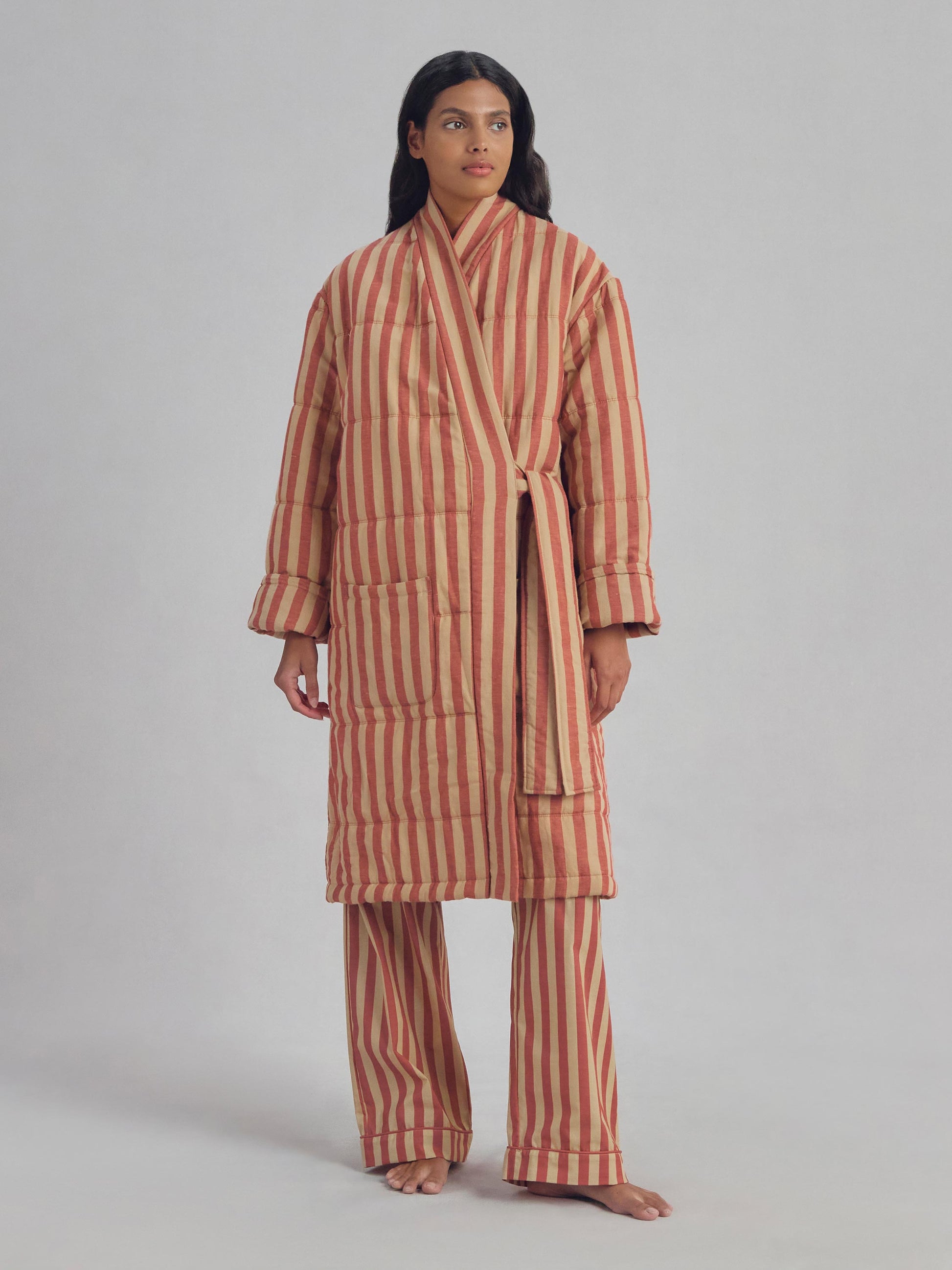 In our iconic Sandstone Red Pembroke Stripe design, this linen blend housecoat is your go-to for staying cozy – from chilly mornings to relaxed evenings on the sofa. With its oversized style, quilted design and practical pockets, it’s set to become your new loungewear staple.