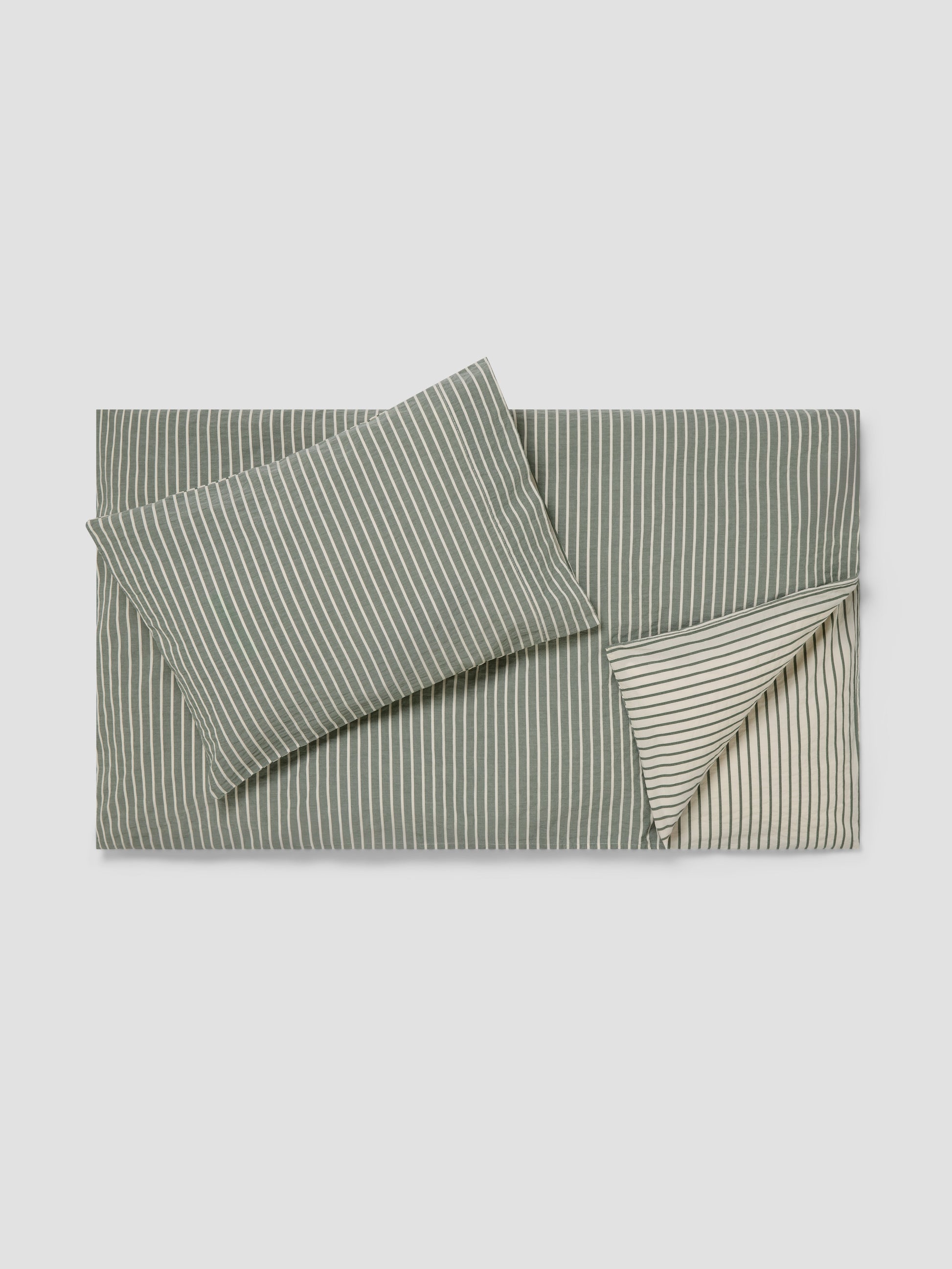 Classic stripes with a clever two-in-one design make mixing and matching as easy as can be with this Spruce Green Textured Stripe bedding set. Crafted from sustainably sourced cotton, our kids bedding has a super soft, breathable feel that’s gentle on even the most sensitive skin. The crib size duvet cover is designed with an internal flap, which closes inside the cover and holds the duvet in place. The twin size duvet cover features natural corozo buttons, so to ensure children's safety, please fasten the buttons inside.