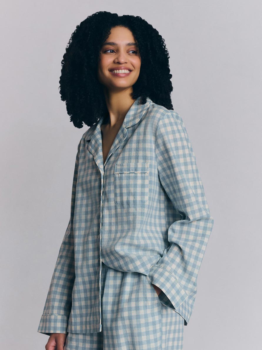 Made for easy, breathable wear, our Warm Blue Gingham linen blend pajama trouser set will have you waking up feeling refreshed and ready to seize the day. Combining the laid-back look of linen with the gentle softness of cotton in our beloved gingham pattern, these pajamas are destined to become your new nighttime favorite.