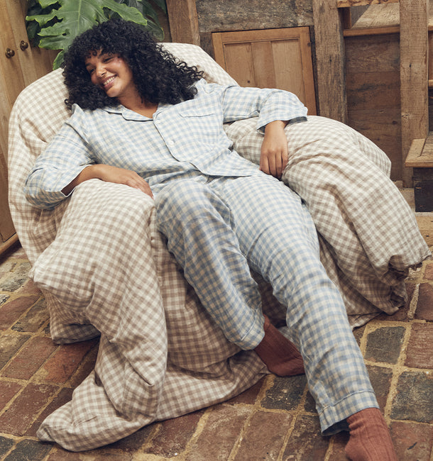 Made for those who like their sleepwear to be timeless yet comfortable, our Warm Blue Gingham Pajama Shirt is made from super soft 100% stonewashed linen. Linen keeps you cozy and warm in the winter and cool in the summer. Our linen pajama shirt can be paired with our pajama pants to complete the look. Our gingham sleepwear is an oversized, and more relaxed fit than our core range; we recommend sizing down if a more snug fit is desired.