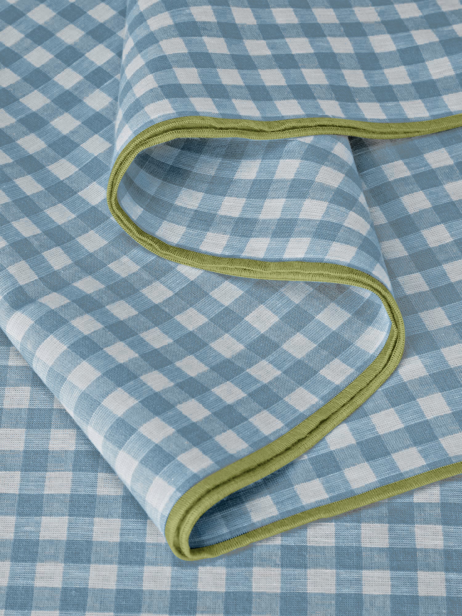 Made in Portugal, our Gingham Linen Table Runners bring a splash of color and a personal touch to your table setting. Made from 100% European linen, our Warm Blue table runner is edged with a contrasting border in a pleasing light Green. Complete the look with the rest of our gingham linen tableware collection, from napkins and placemats to tablecloths.