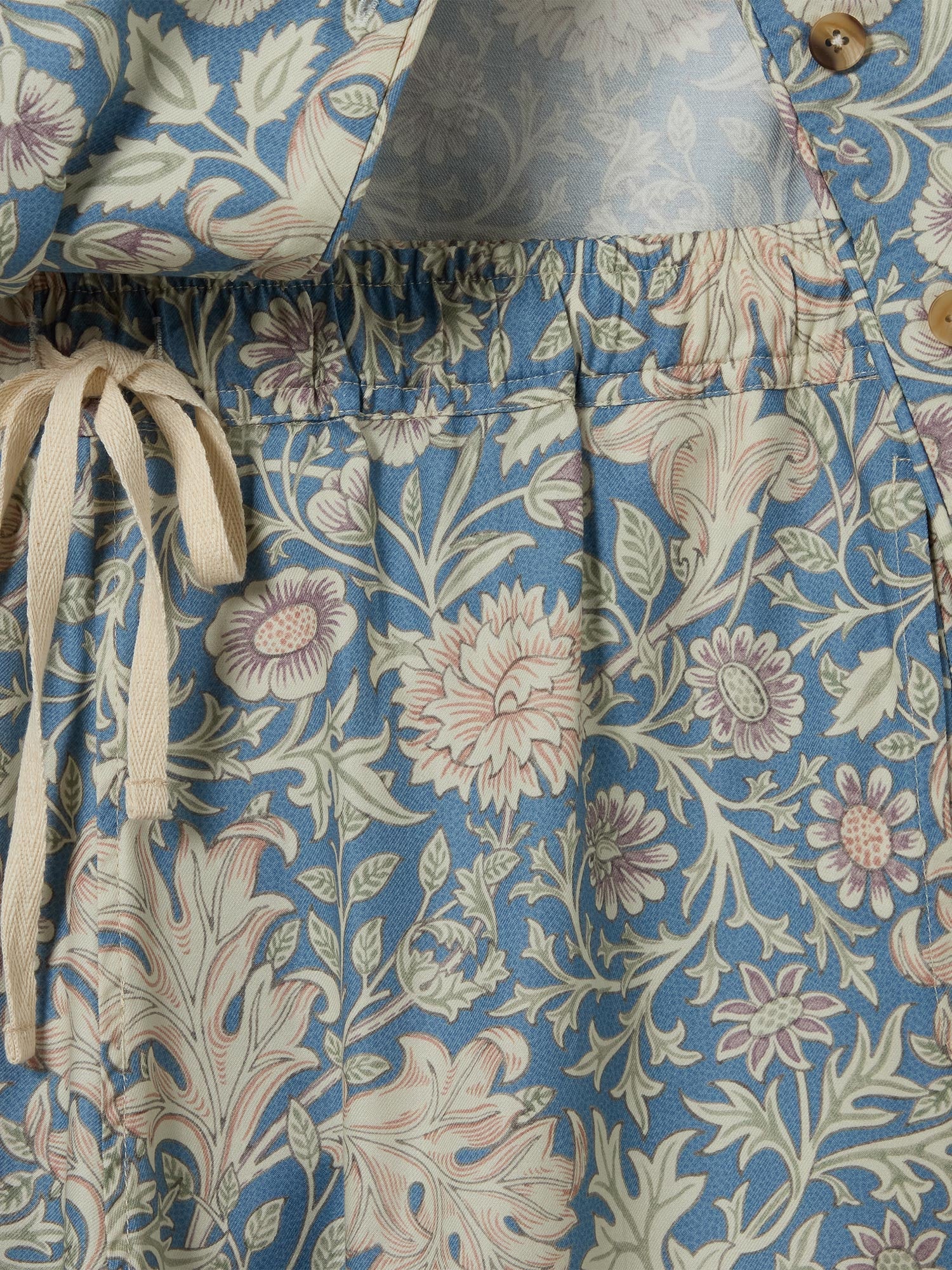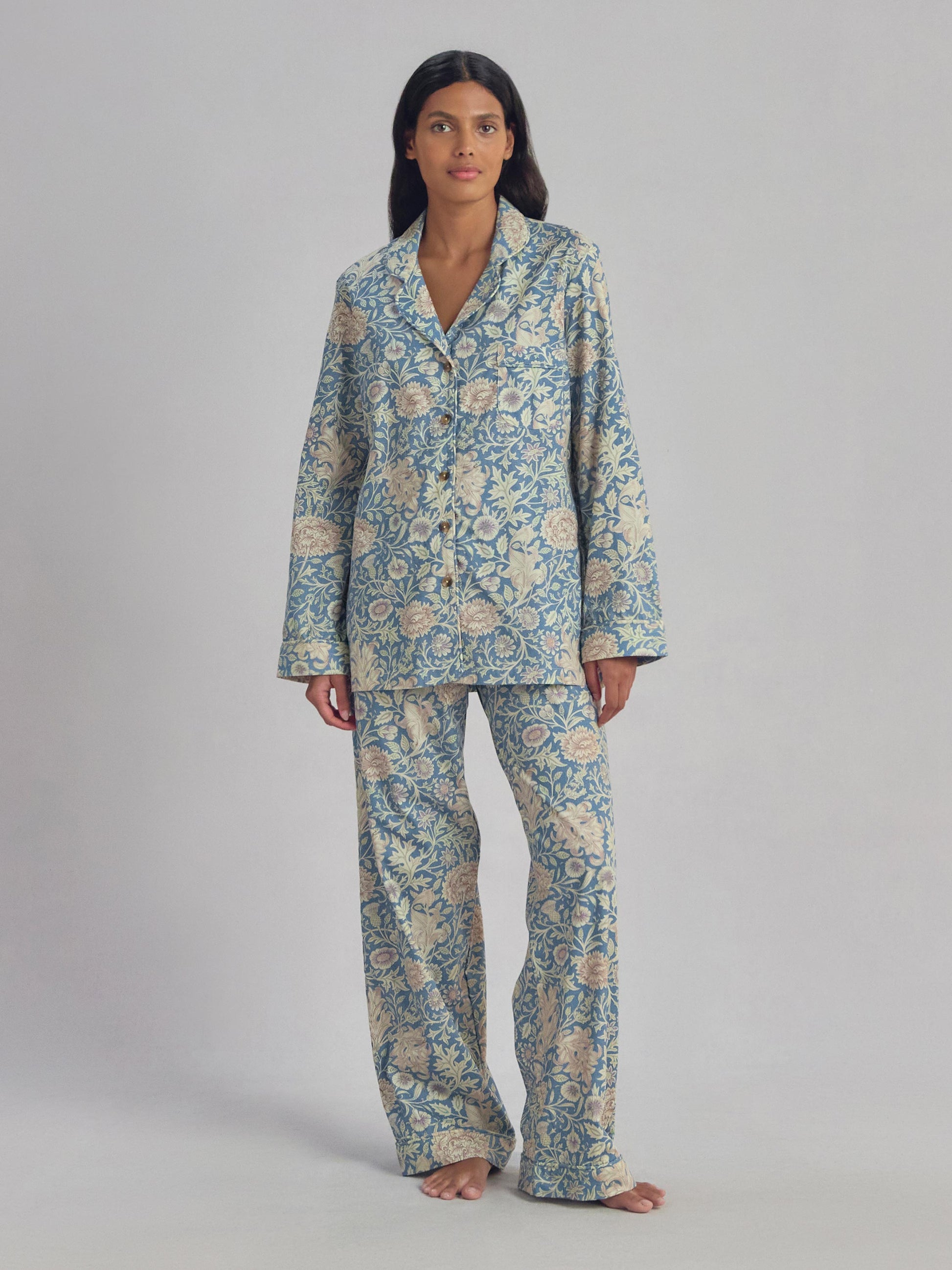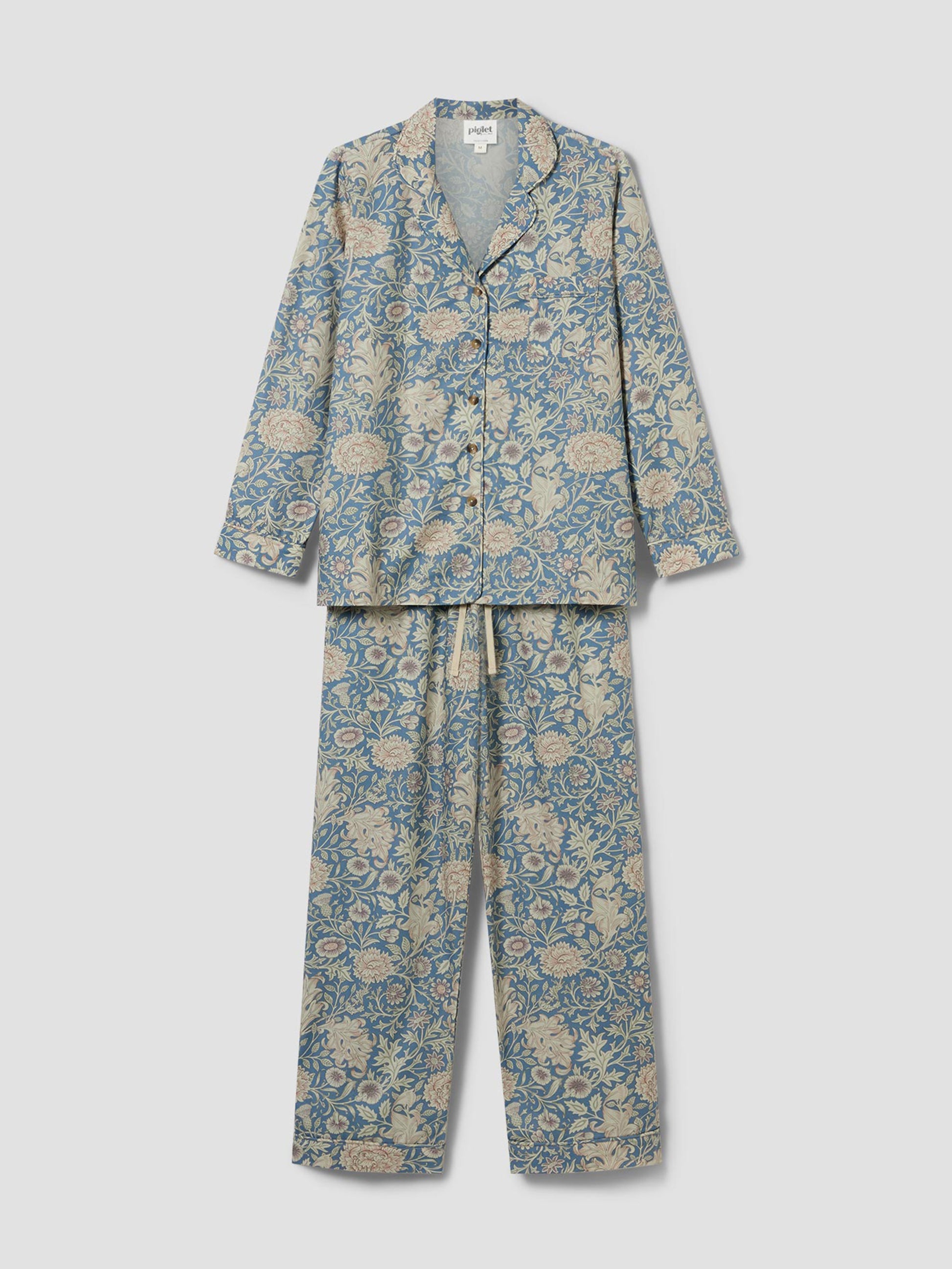 Featuring a ¾ sleeve shirt and cropped pants, this Morris & Co. cotton pajama set features the much-loved Double Bough pattern, with scrolling acanthus leaves and abundant blooms in a rich Webbs Blue hue. Crafted from 100% prewashed cotton for extra softness and a lived-in feel, this is loungewear you’ll want to stay in all day long.